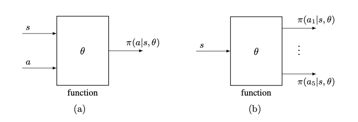 value-based → policy-based. In this case, the policy can be written as $\pi (a|s, \theta)$, where $\theta \in \mathbb{R^m}$ is a parameter vector. This means that we can also use function to represent the policy. Function-represented policies optimal policies can be obtained through policy gradient method, which is policy-based method. It is more efficent for handling larget spaces.