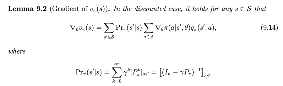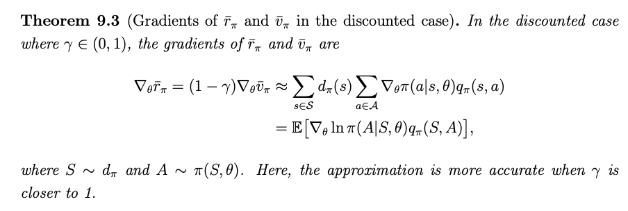 $$ \nabla_\theta J(\theta) = \mathbb{E}_{S\sim \eta, A \sim \pi(S, \theta)}[\nabla_\theta \ln \pi (A|S, \theta )q_\pi(S, A)] $$Derivation of the gradients in the discounted case
